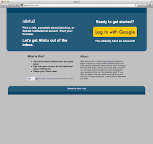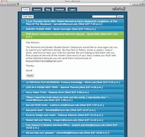 For those students, let me be clear: I'm shutting down allstu2, but you can still send allstus. The allstu mailing list is run by the college, and anyone with a Kenyon email address can send a message to the list by sending an email to allstu@kenyon.edu. You can subscribe to the mailing list to receive all of the messages in your inbox. If you would prefer to browse the messages online, the college maintains the mailing list archives, as long as you only need to check it from on-campus and don't mind a slightly dated interface. Once again, the Thrill has a pretty good guide for setting up the allstu without flooding your inbox.